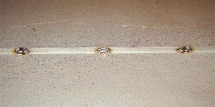 Mit dem WPM-P ausgeführte Heftpunkte an einer Verbindung aus überlappt angeordneten Blechen (1,5 mm 1.4402); Schweißzeit: 0,4 s/Pkt.