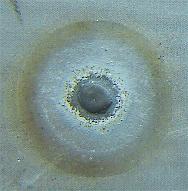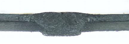 Makroschliff einer Plasma-Punktschweißverbindung aus 0,8 mm elektrolyt. ver- zinktem Blech auf 1,0 mm feuerverzinktem mit Zusatzwerkstoff SG 2 geschweißt, (Punktdurchmesser in der Fügeebene: 5,5 mm),
