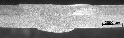 Makroschliff einer Plasma- Punktschweißverbindung 1,0 mm auf 1,2 mm aus feuerverzinkten höherfesten Stahlblechen mit Zusatzwerkstoff SG 2 geschweisst