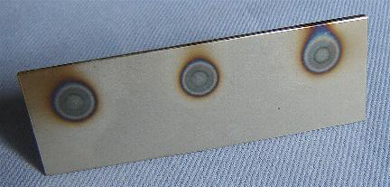 Vorderseite einer plasmapunktgeschweißten Verbindung aus 2,0 mm auf 1,5 mm Schwarzblech, (Schweißzeit pro Punkt = 1,2 s)