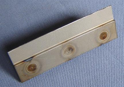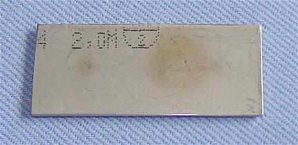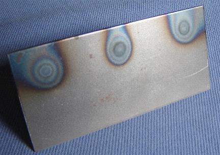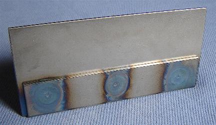Vorderseite einer plasmapunktgeschweißten Verbindung aus 1,0 mm auf 1,5 mm Edelstahl, Werkstoff: 1.4301, (Schweißzeit pro Punkt = 0,8 s)
